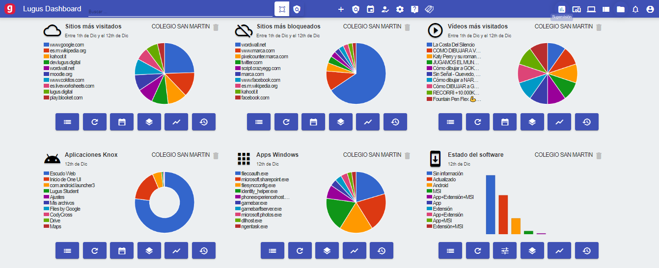- Dashboard o panel de control, que facilita la tarea del administrador TIC de la escuela, le permita supervisar la navegación de los dispositivos en las horas de clase y actuar si es necesario configurando el Filtro de Internet fácilmente, en ningún caso espía y accede a los mensajes de los estudiantes. Otra de las muchas funciones que realiza es la de permitir las aplicaciones que se pueden utilizar en el proyecto educativo. Puede medir el uso de las aplicaciones y ver el estado de actualización del software en los dispositivos.