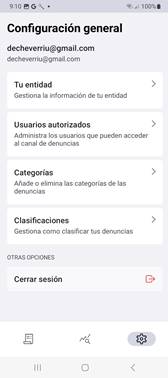 - Configuración: En este punto podrás editar los datos de tu entidad, configurar el comportamiento del borrado de denuncias, consultar los avisos legales y extraer los enlaces de Nueva denuncia y de Seguimiento de una Denuncia para publicar en vuestra web.
