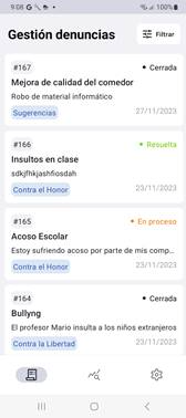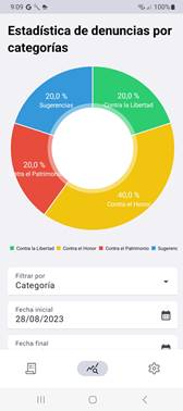- Estadísticas: Resumen gráfico de las denuncias recibidas, entre dos fechas, clasificadas por Categoría, Estado o Gravedad.