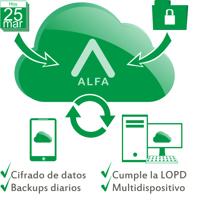 - AlfaCloud tiene como objetivo potenciar la flexibilidad y la seguridad: La flexibilidad a través del acceso web, la compartición de archivos y la instalación del agente en cualquier dispositivo y sistema operativo, y la seguridad con la instalación del certificado digital, el cifrado de datos y cumplimiento de la LOPD. Según esta ley los datos de carácter personal deben estar alojados en servidores ubicados físicamente en España o en cualquiera de los países europeos. Debe además firmarse un contrato con terceros conforme a la LOPD que garantice los mismos niveles de seguridad que los fijados por el responsable del fichero.