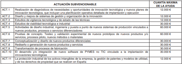 Proyectos: Diagnósticos y planes de innovación tecnológica, Diseño y mejora de sistemas de gestión y organización de la innovación, Estudios de vigilancia tecnológica, Estudios de viabilidad tecnológica e Industrial, Actividades de diseño industrial, ingeniería y puesta a punto de nuevos sistemas de producción vinculados a nuevos productos, procesos o servicios diferenciadores, Pruebas de concepto, Conceptualización y diseño de nuevos productos diferenciales , Transformación de procesos de fabricación, desarrollo y/o integración de nuevo software de PYMES no TIC vinculado a la implantación de innovaciones tecnológicas, Protección industrial/intelectual.