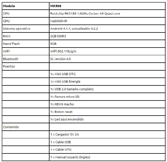 Lo primero que podemos decir acerca de este dispositivo es que nos ha sorprendido su tamaño, no más grande que un pendrive, su potencia, un Quad-Core a 1,6 Ghz, la capacidad de memoria, 2 GB de RAM y un almacenamiento de 8 GB que puede ser ampliado con la inserción de una Micro SD llegando a los 40GB de capacidad interna de almacenamiento máximo. Además cuenta con conexión WIFI y con Bluetooth. Es sin lugar a duda un rápido y versatil MiniPc de bolsillo.