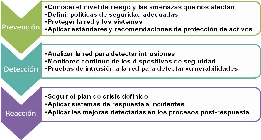 Las actividades preventivas definidas en la figura de arriba son necesarias para llevar a cabo tareas de detección y posibilitar un análisis de la infraestructura de la red que permita detectar vulnerabilidades e intrusiones. Esta actividad se desarrolla de manera continua; no es posible analizar la red una vez para confiar en su seguridad. Por tanto, para garantizar la seguridad, es necesario añadir una capa de valor adicional a los equipamientos de detección con un servicio de monitorización continua de la red. A partir de este punto, es posible detectar incidencias de seguridad e intrusiones no autorizadas en tiempo real.