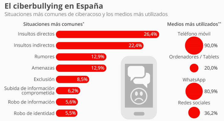 Situaciones como insultos, rumores vejatorios, amenazas, exclusiones, etc., son cada vez más frecuentes en los terminales usados por niños y adolescentes con devastadoras consecuencias, como muestra la siguiente estadística elaborada por Save the Children y ANAR.