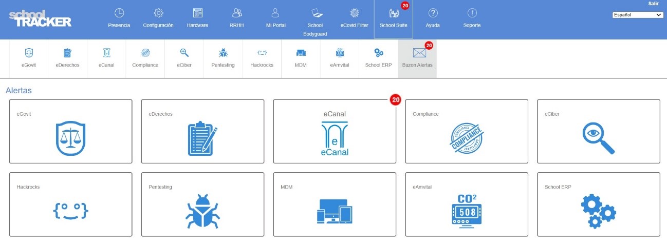 Complementando todas estas soluciones, School Suite cuenta con eAlertas, que permite recopilar en un apartado exclusivo, las incidencias más destacadas detectadas en cada uno de los servicios integrados:
