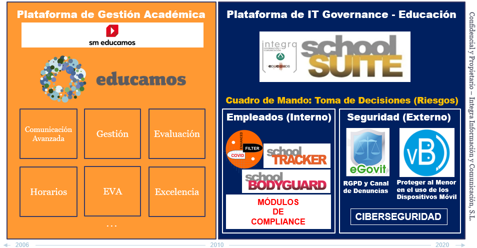 El plan inicial era desarrollar un conjunto de módulos complementarios, en un concepto denominado School Suite, con el objetivo de apoyar a nuestro colectivo en el cumplimiento de las distintas normativas vigentes y a minimizar la matriz de riesgos inherentes al uso de la tecnología, tanto a nivel interno como externo. Es decir, por un lado, sensibilizar a los responsables de los centros e instituciones de los distintos riesgos en el uso de las TIC y, por otro lado, generar avisos ante escenarios de incumplimiento, peligro o incidencia.