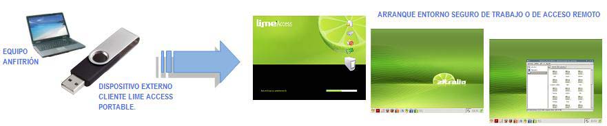 Por tanto, el cliente Lime Access funciona como un completo entorno virtual seguro y totalmente portable (se distribuye fácilmente mediante la distribución de dispositivos externos y se puede arrancar sobre cualquier equipo), generando de forma automática un entorno seguro totalmente parametrizado por la organización (entorno Linux o Windows, con las aplicaciones, mecanismos de acceso y funcionalidades necesarias), facilitando en gran medida las necesidades de gestión y mantenimiento, posibles migraciones, etc.