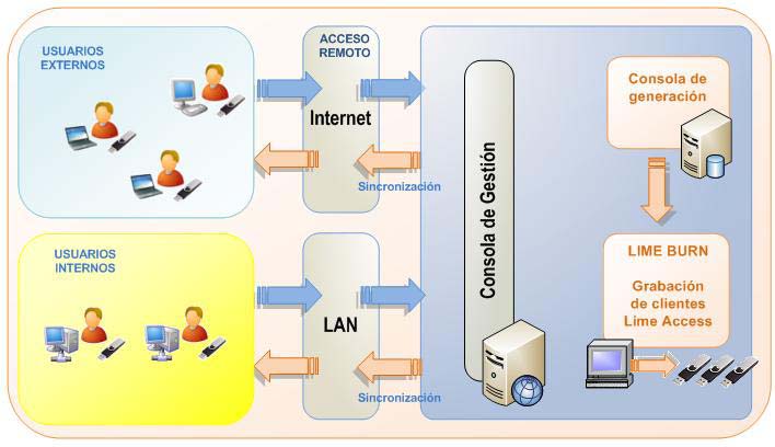 - Una Consola de Gestión que permitirá la administración y configuración remota de los distintos clientes Lime Access distribuidos por la Organización, mediante un proceso de sincronización periódica.
