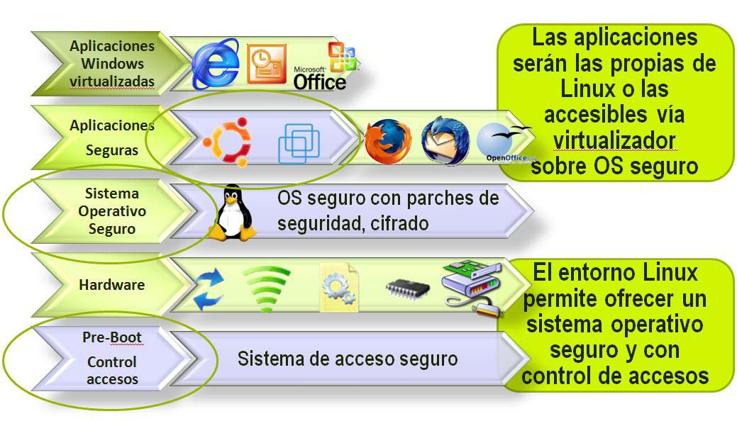 Sobre el sistema operativo base seguro se incluyen las funcionalidades, aplicaciones, máquinas virtuales y, en general, el software necesario para generar un entorno virtual de trabajo totalmente parametrizado por la Organización.